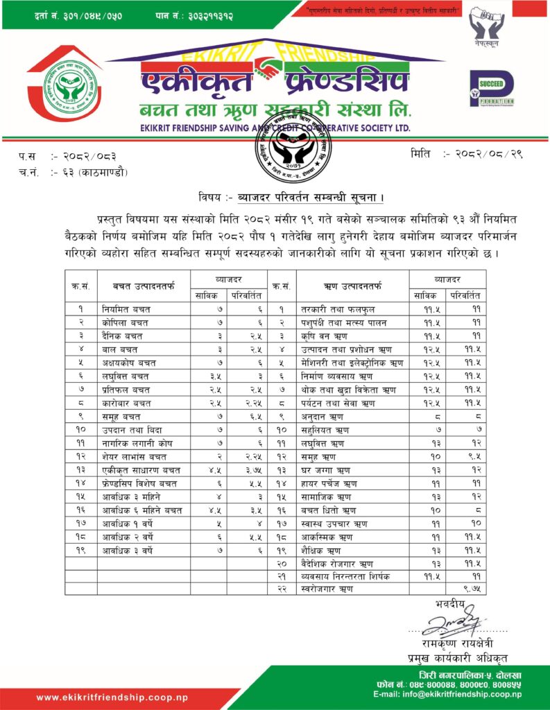 दोलखा जिल्लाको जिरीमा मुख्य कार्यालय रहेको एकीकृत फ्रेण्डसिप साकोसको आफ्नो वार्षिक कार्ययोजना अनुसार संस्थाको गौरव सेवाकेन्द्रको आयोजनामा आज मिति २०८१ फाल्गुन १२ गते, सोमबार जिरी न. पा. वडा नं. ४, कुने स्थित गौरव सेवाकेन्द्रको सभाहलमा “विस्तारित मञ्च तथा वित्तीय साक्षरता कार्यक्रम” सम्पन्न भएको छ । सहकारीको परिचय, बचत तथा ऋणको महत्व, पारिवारिक बजेट, संस्थाले प्रदान गरिरहेको सेवा सुविधा तथा प्रविधिमार्फत प्रदान गरिरहेका सेवाहरु लगायतका विषयहरुमा विस्तारित मञ्च तथा वित्तीय साक्षरता कार्यक्रम संस्थाका प्रमुख कार्यकारी अधिकृत रामकृष्ण रायक्षेत्रीले प्रस्तुतीकरण प्रस्तुत गर्नुभएको सो कार्यक्रम संस्थाका नायब प्रमुख कार्यकारी अधिकृत राम बहादुर खत्रीले संचालन गर्नू भएको थियो । विस्तारित मञ्च तथा वित्तीय साक्षरता कार्यक्रममा गौरव सेवाकेन्द्र संचालन उपसमिति सदस्य भगवती कार्की, मिन बहादुर जिरेल सहित ७० जना सदस्यहरुको उपस्थिति रहेको थियो ।